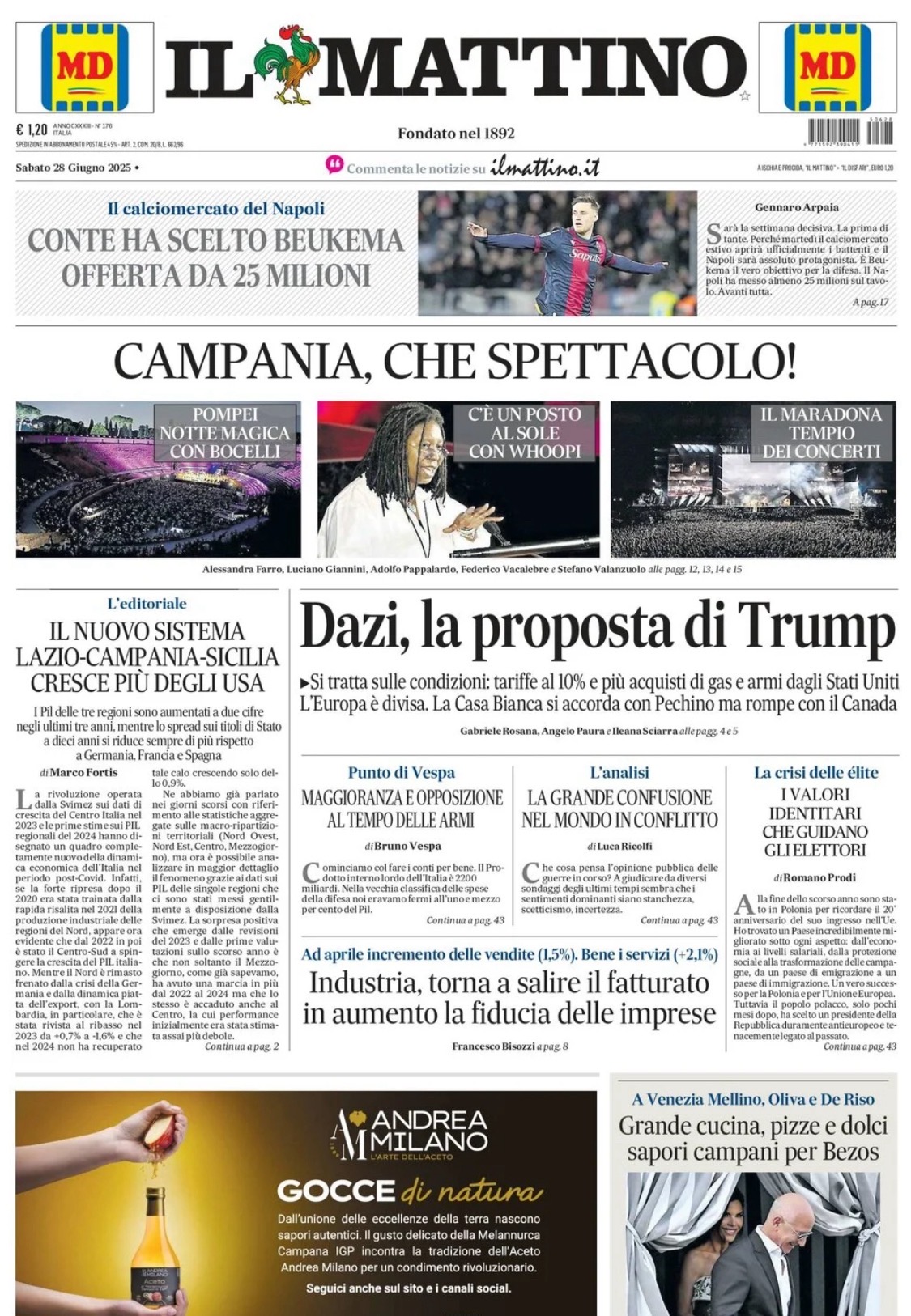 Il Mattino in taglio alto: "Conte ha scelto Beukema, offerta da 25mln"