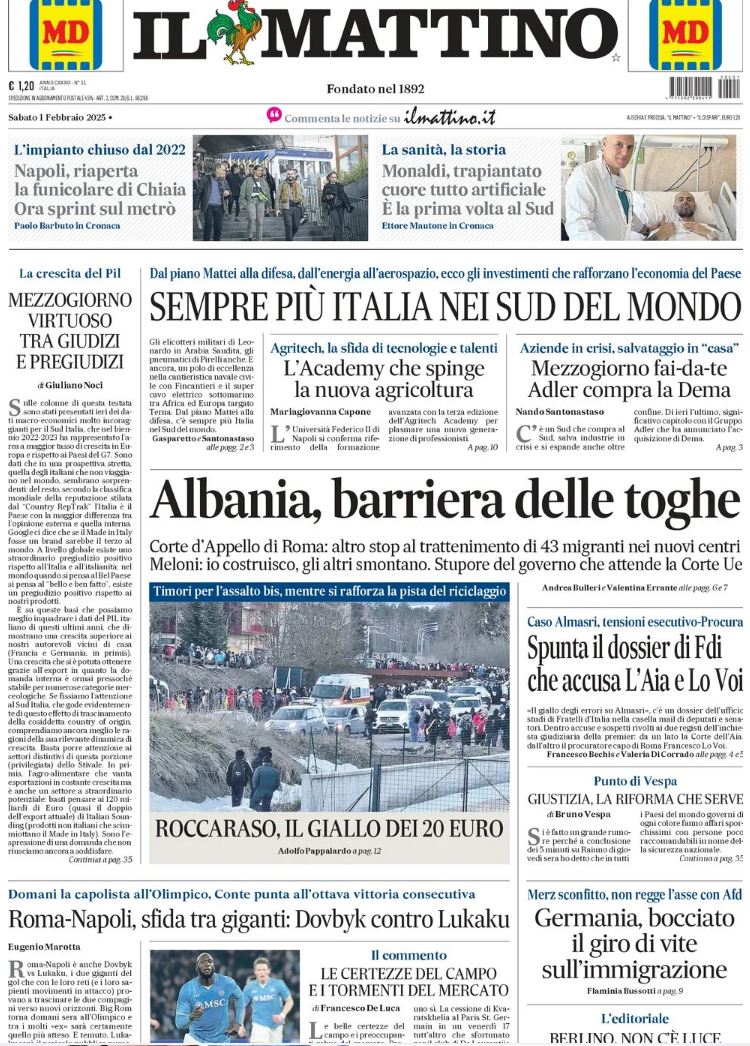 Il Mattino in taglio basso: "Roma-Napoli, sfida tra giganti: Dovbyk contro Lukaku"