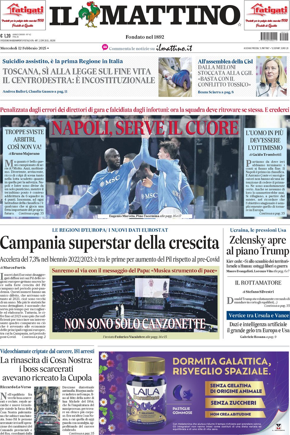 "Napoli, serve il cuore". Un'esortazione di tutto l'ambiente partenopeo, ma anche uno dei titoli presenti nella prima pagina di oggi de Il Mattino. Azzurri i calo, con 2 pareggi nelle ultime 2 partite.
