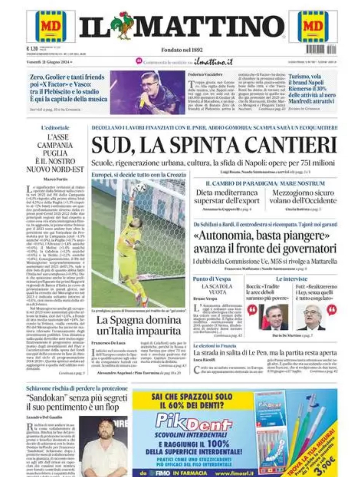 Nell'edizione di oggi, Il Mattino dedica spazio in prima pagina alla pesante sconfitta dell’Italia contro la Spagna: “La Spagna domina un’Italia impaurita. Europei, si decide tutto con la Croazia”. Di seguito la prima pagina integrale.