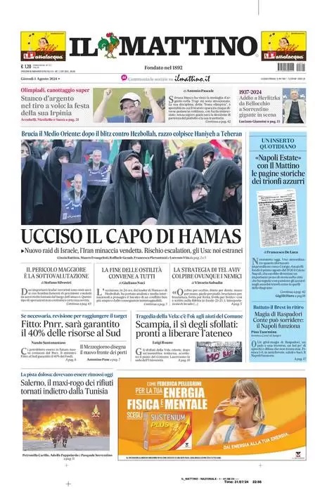 Nell'edizione di oggi, Il Mattino dedica spazio in prima pagina al Napoli che batte 1-0 il Brest nella seconda amichevole a Castel di Sangro: "Magia di Raspadori: Conte può sorridere, il Napoli funziona". In apertura l'uccisione di Haniyeh a Teheran: "Ucciso il capo di Hamas". Di seguito la prima pagina integrale.