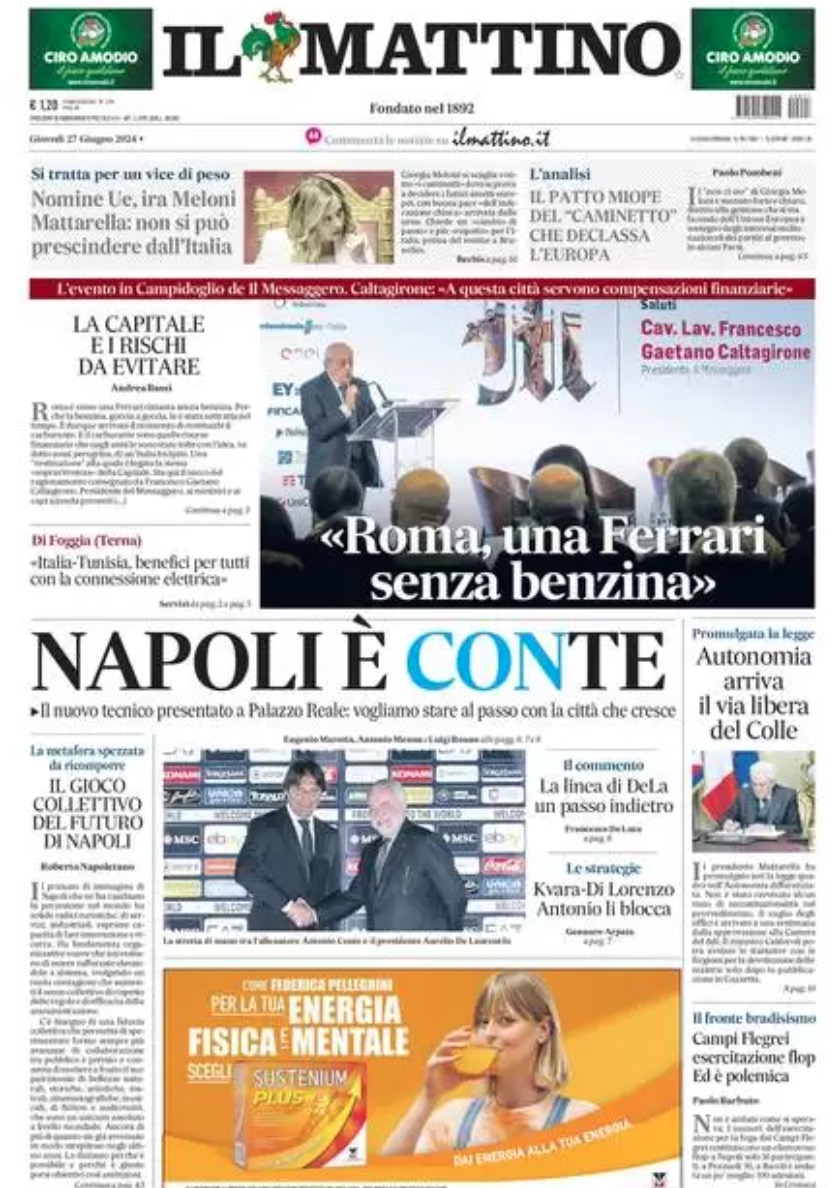 "Napoli è Conte", titola in prima pagina il quotidiano partenopeo Il Mattino per raccontare della presentazione del nuovo tecnico a Palazzo Reale: "vogliamo stare al passo con la città che cresce", il passaggio evidenziato dal quotidiano. "Kvara-Di Lorenzo, Antonio li blocca" e "La linea di ADL, un passo indietro", gli altri spunti di riflessione. Di seguito la prima pagina integrale