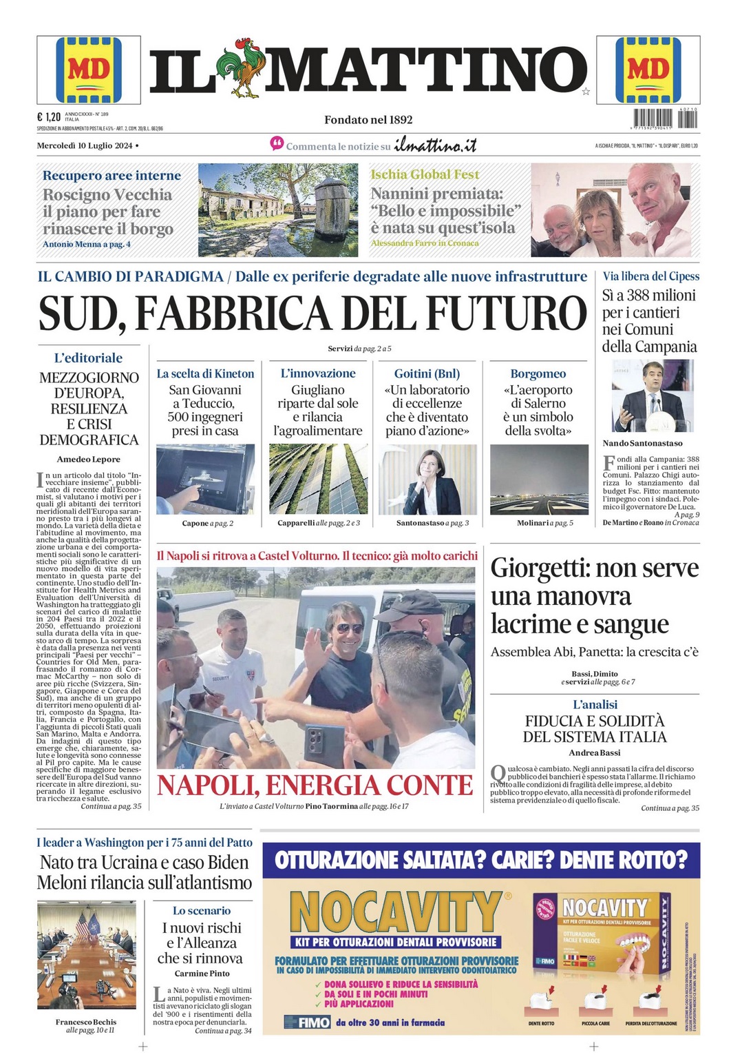 Nell'edizione di oggi, Il Mattino dedica spazio al nuovo Napoli di Antonio Conte che si è radunato a Castel Volturno ieri: "Napoli, energia Conte. Il Napoli si ritrova a Castel Volturno. Il tecnico: già molto carichi". Di seguito la prima pagina integrale.