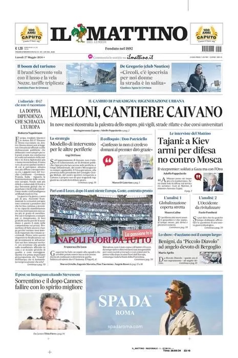 Nell'edizione di oggi, Il Mattino dedica spazio allo 0-0 del Napoli con il Lecce che non permette agli azzurri di qualificarsi per la prossima Conference League: "Napoli fuori da tutto. Pari con il Lecce, dopo 14 anni niente Europa". Spazio anche ad Antonio Conte, prossima alla firma con il Napoli: "Conte, contratto pronto". Di seguito la prima pagina integrale.