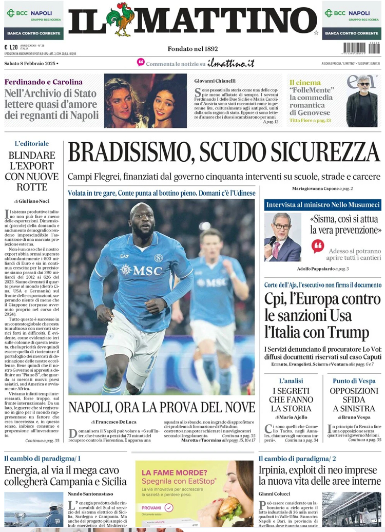 "Napoli, ora la prova del nove". Questo il titolo in prima pagina dell'edizione odierna de Il Mattino. La squadra di Antonio Conte scenderà in campo domani al "Maradona" contro l'Udinese. Una sfida che servirà agli azzurri per provare ad aumentare il distacco in classifica sull'Inter. Un match non facile contro una squadra difficile da affrontare.
