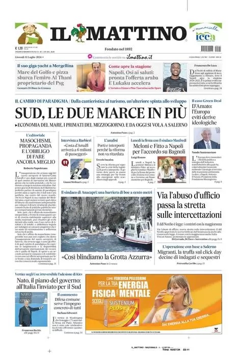 Nell'edizione di oggi, Il Mattino dedica spazio al mercato del Napoli in prima pagina: "Napoli, Osi ai saluti: pronta l'offerta araba. E Lukaku accelera". Intanto oggi inizia il ritiro estivo a Dimaro: "Conte apre la stagione". Di seguito la prima pagina integrale.