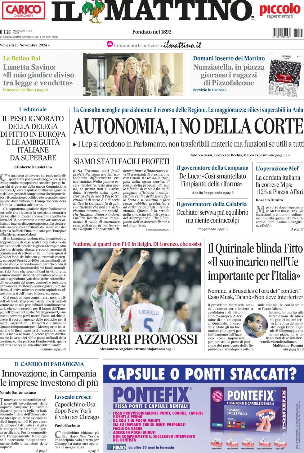 "Nations, ai quarti con l'1-0 al Belgio: Di Lorenzo, che assist". L'Italia vince in Belgio con il guizzo di Tonali e strappa tre punti che si traducono con la qualificazione ai quarti di finale di Nations League. Nella prima pagina della sua edizione odierna Il Mattino approva le prestazioni dei due napoletani Buongiorno e Di Lorenzo, con quest'ultimo autore dell'assist decisivo.
