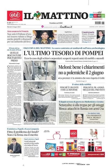 Nell'edizione di oggi, Il Mattino dedica spazio in prima pagina al tesoro rubato a Diego Armando Maradona: "Non solo il Pallone d'oro, nel tesoro rubato a Diego anche gioielli e diamanti per un miliardo (di lire). Asta sospesa in Francia". In apertura gli scavi di Pompei, con lo scavo sottratto ai tombaroli: "L'ultimo tesoro di Pompei". Di seguito la prima pagina integrale.