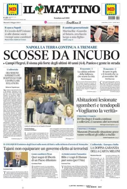 "Scosse da incubo", titola Il Mattino in prima pagina nell'edizione odierna, parlando delle scosse di terremoto che nella giornata di ieri hanno colpito i Campi Flegrei e le zone circostanti. Il commento: "Campi Flegrei, il sisma più forte degli ultimi 40 anni (4,4). Panico e gente in strada". Di seguito la prima pagina integrale