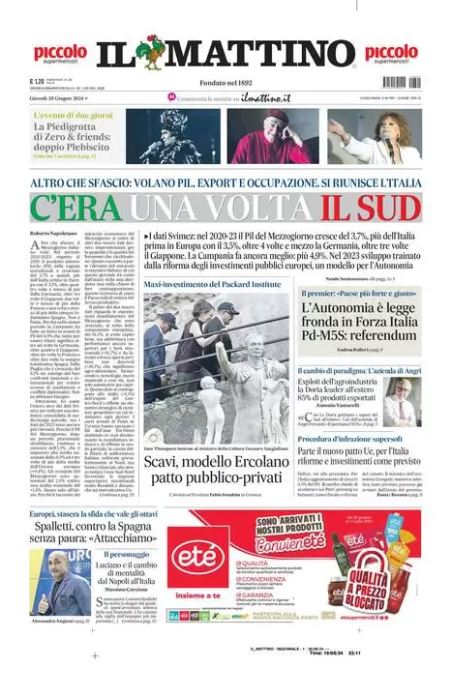 "Europei, stasera la sfida che vale gli ottavi. Spalletti contro la Spagna senza paura: 'Attacchiamo'", scrive così in prima pagina l'edizione odierna de Il Mattino parlando delle dichiarazioni del ct della Nazionale italiana, intervenuto in conferenza stampa alla vigilia del match contro la Spagna. Di seguito la prima pagina integrale
