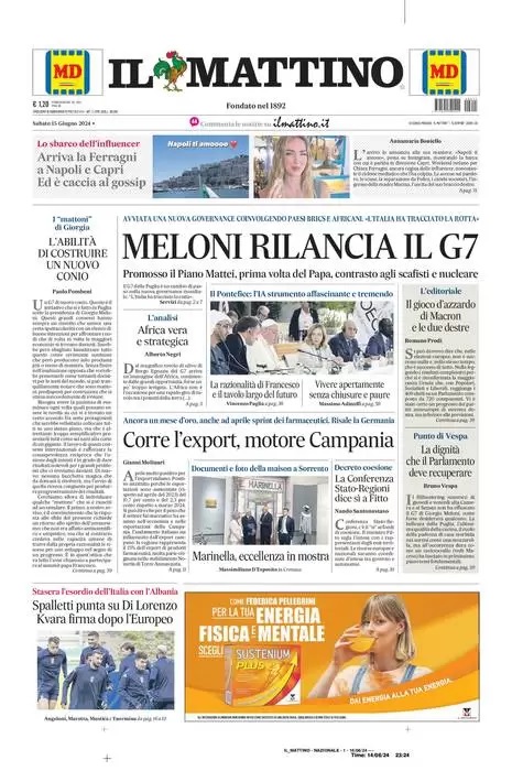 Nell'edizione di oggi, Il Mattino dedica spazio in prima pagina alla Nazionale, che stasera fa il suo esordio agli Europei, e al rinnovo di Kvaratksheklia con il Napoli: "Spalletti punta su Di Lorenzo. Kvara firma dopo l'Europeo. Stasera l'esordio dell'Italia con l'Albania". Di seguito la prima pagina integrale.