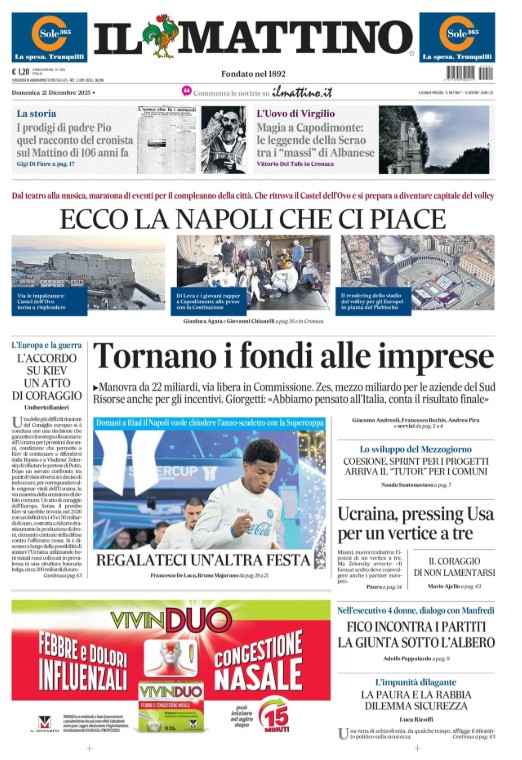 "Regalateci un'altra festa". Questo il titolo in prima pagina dell'edizione odierna de Il Mattino. Il Napoli si prepara alla finale di Supercoppa Italiana contro il Bologna di domani. Dopo aver eliminato il Milan in semifinale la squadra di Antonio Conte si prepara all'ultimo atto del torneo in quel di Riad. L'avversario non sarà dei più facili, quel Bologna vincitore della Coppa Italia e che ha eliminato ai calci di rigore l'Inter.