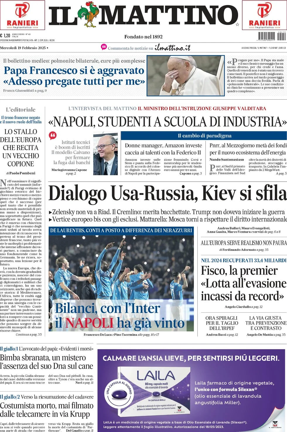 "Con l'Inter il Napoli ha già vinto" scrive Il Mattino in prima pagina. Nel post Moratti continui cambiamenti al vertice nerazzurro, salda la guida di De Laurentiis: il patron azzurro non è stato mai costretto a effettuare ricapitalizzazioni per sistemare i conti.