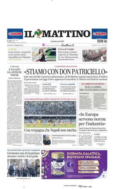 "Una vergogna che Napoli non merita", titola Il Mattino in prima pagina nell'edizione odierna, commentando la deludente sconfitta degli azzurri contro il Bologna. Il commento in alto al box: "Azzurri battuti dal Bologna. Rabbia e fischi dei tifosi, il club riapre a Conte". Di seguito la prima pagina integrale
