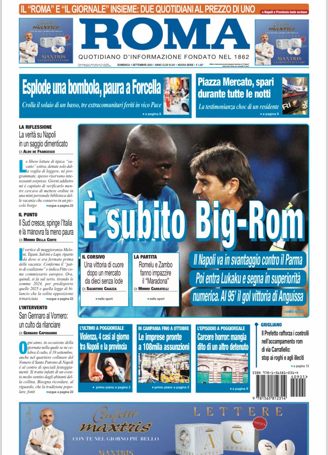 "E' subito big-Rom", titola in prima pagina il quotidiano partenopeo Il Roma per raccontare della vittoria in rimonta del Napoli sul Parma al Maradona. "Una vittoria di cuore dopo un mercato da dieci senza lode", il titolo del fondo di Salvatore Caiazza. Di seguito la prima pagina integrale