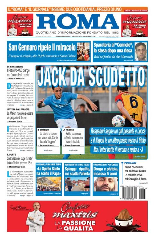 "Jack da Scudetto". E' questo il titolo d'apertura dell'edizione odierna de Il Roma. Il quotidiano campano prosegue e scrive ancora: "Raspadori segna un gol pesante e il Napoli fa un altro passo verso il titolo. Ma l'Inter batte il Verona e resta a -3".