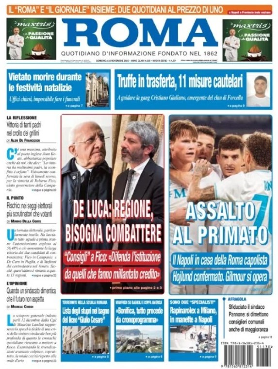 "Assalto al primato". E' questo il titolo d'apertura de Il Roma, dedicato ovviamente al big match di stasera tra Roma e Napoli. Gli azzurri - si legge - se la giocheranno ancora con Hojlund da centravanti, alla ricerca di punti utili per il sorpasso.