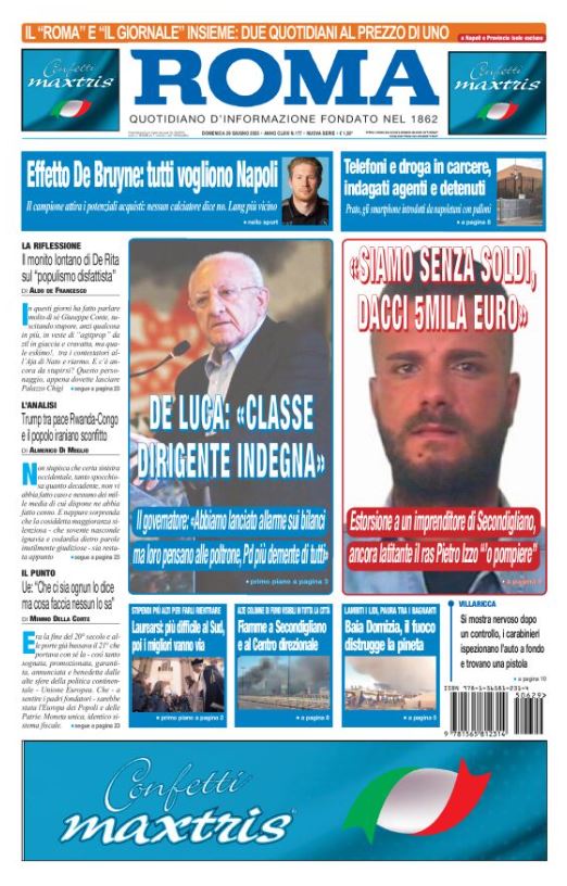 "Effetto De Bruyne: tutti vogliono Napoli". E' questo il titolo scelto dall'edizione odierna de Il Roma in prima pagina. Il campione attira altri campioni - si legge - e altri potenziali acquisti non dicono di no. Come Noa Lang, ad esempio, citato dal quotidiano in prima pagina.