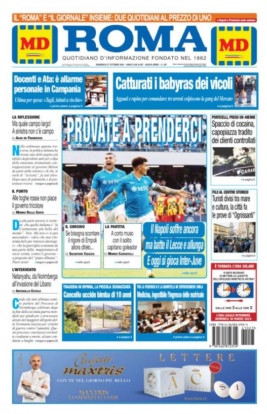 "Provate a prenderci". E' questo il titolo che Il Roma dedica in prima pagina al Napoli all'indomani del successo contro il Lecce e dell'allungo in classifica a +5 sull'Inter, in attesa del match contro la Juventus.