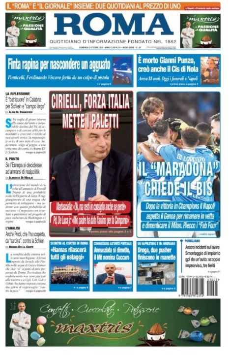"Il Maradona chiede il bis". E' questo il titolo con cui Il Roma apre la sua prima pagina oggi in edicola. Dopo la vittoria in Champions, il Napoli aspetta il Genoa per rimanere in vetta e dimenticare il Milan, si legge ancora. Per il quotidiano dovrebbero essere confermati i Fab 4 a centrocampo.