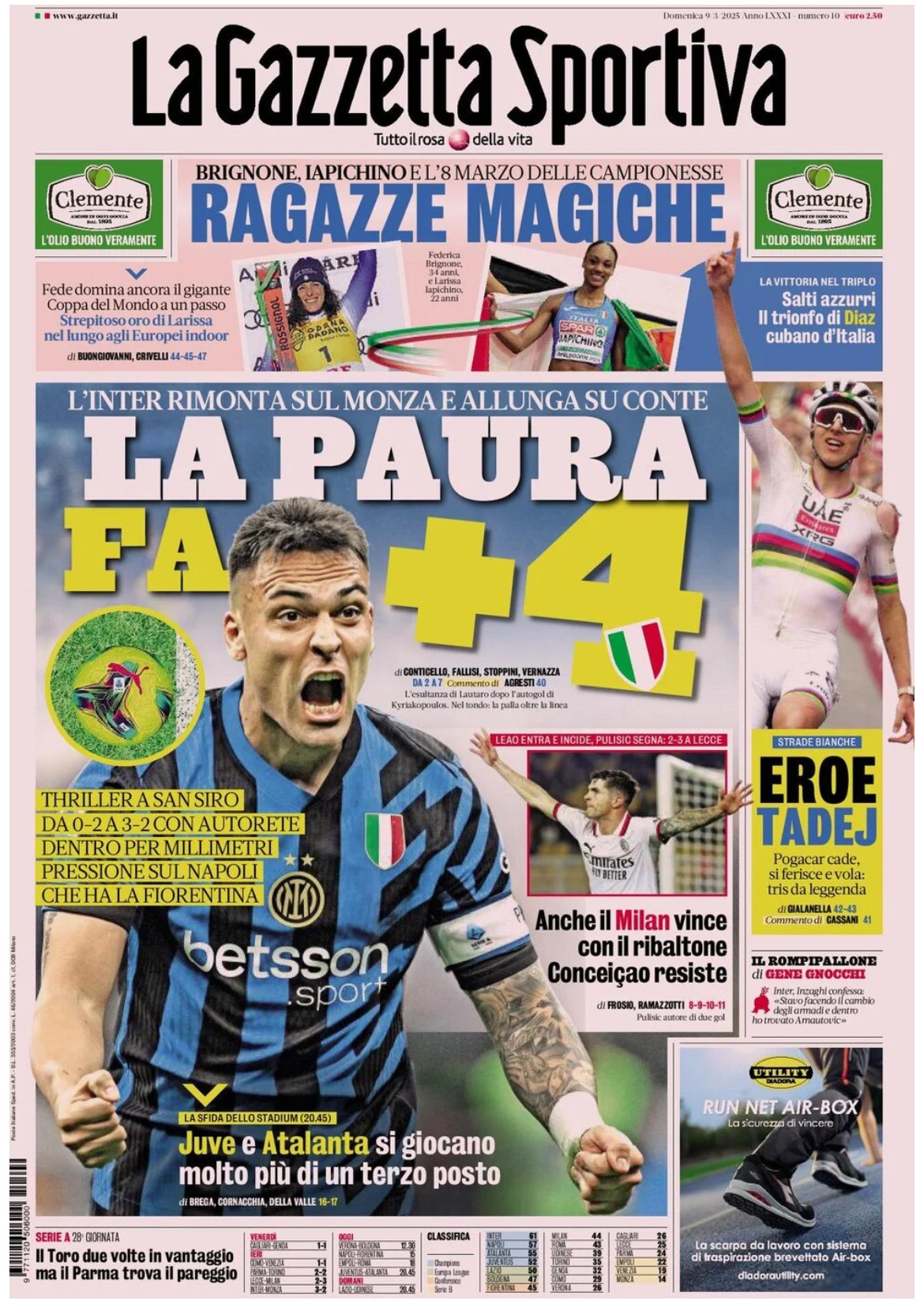 La Gazzetta dello Sport apre con l'allungo Inter: "La paura fa +4"