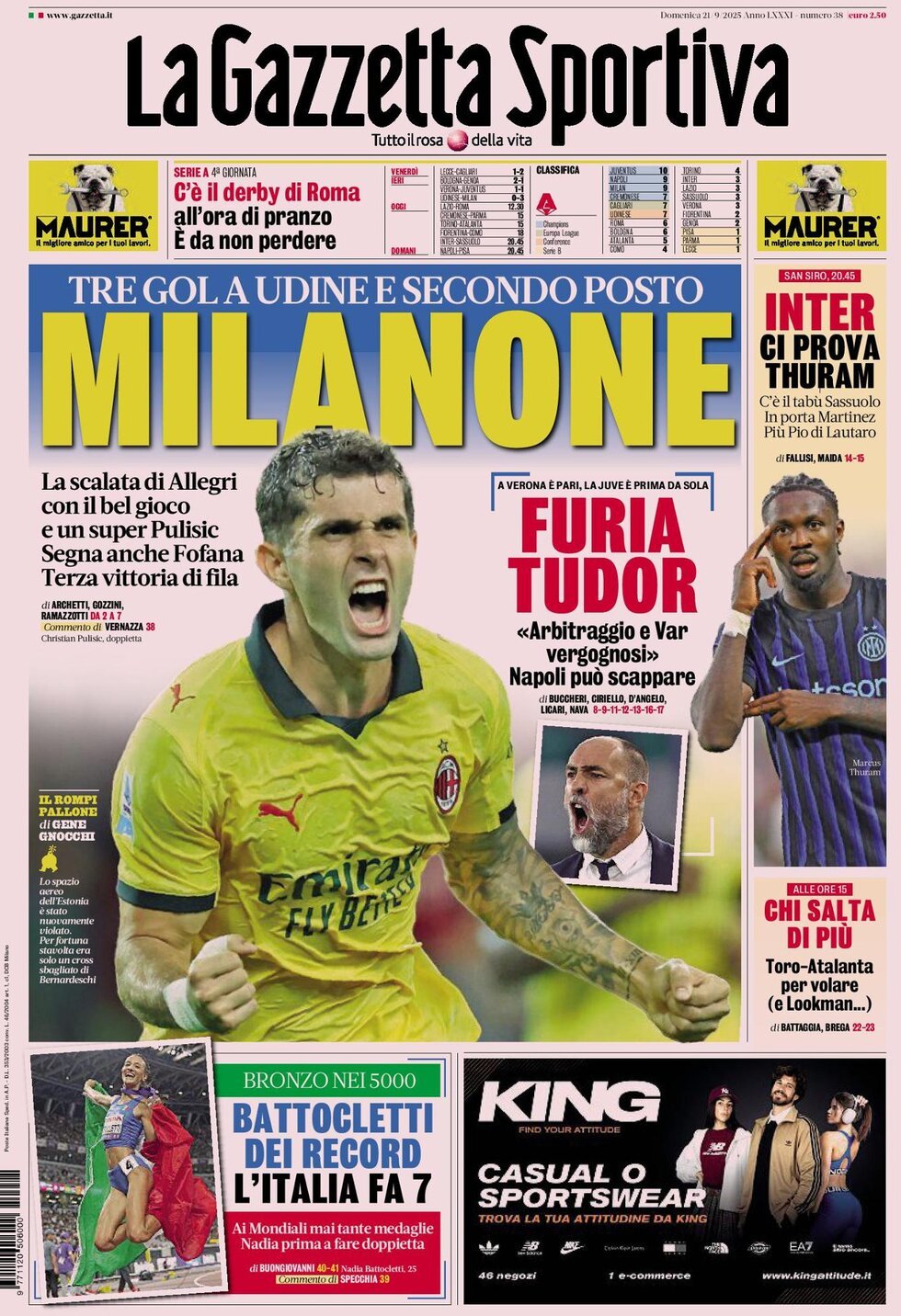 La Gazzetta dello Sport in apertura: "Tre gol a Udine e 2° posto, Milanone!"