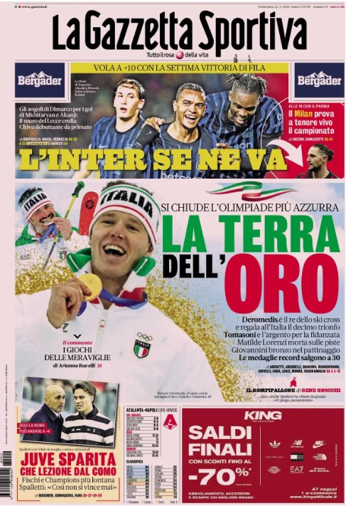 "L'Inter se ne va". E' questo il titolo d'apertura dell'edizione odierna de La Gazzetta dello Sport all'indomani del successo nerazzurro sul campo del Lecce. Spazio anche alla sconfitta della Juventus, in casa, contro il Como: "Juve sparita, che lezione dal Como!", si legge.
