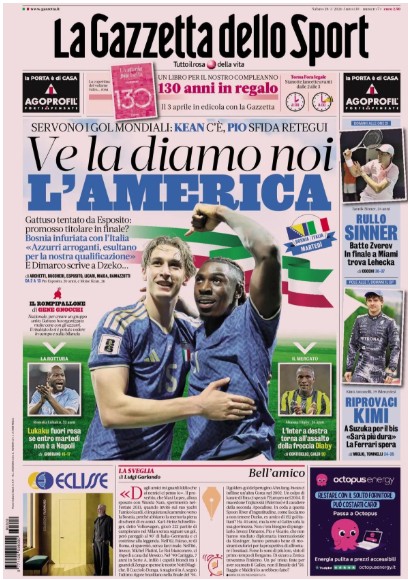 "Ve la diamo noi l'America" scrive La Gazzetta dello Sport in apertura quest'oggi. Servono i gol Mondiali: Kean c'è, Pio Esposito sfida Retegui per una maglia da titolare in Bosnia. Gattuso tentato dal giovane interista: promosso titolare in finale? Bosnia infuriata con l'Italia: "Azzurri arroganti, esultano per la nostra qualificazione". E Dimarco scrive a Dzeko.