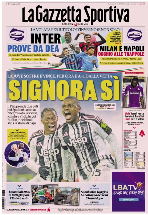 "Milan e Napoli, occhio alle trappole". E' questo il titolo che La Gazzetta dello Sport dedica alle partite di rossoneri e azzurri oggi in edicola. "Neres a Cremona contro il mal di trasferta", si legge ancora. In primo piano il successo della Juventus contro il Pisa: "Signora sì".