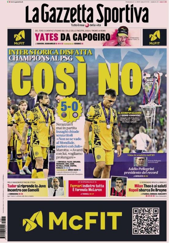 "Così no". Questo il titolo in prima pagina dell'edizione odierna della Gazzetta dello Sport. Una sconfitta senza precedenti quella dell'Inter che viene travolta per 5-0 nella finale di Champions League. In taglio basso spazio anche a un titolo sul Napoli e sull'imminente arrivo di Kevin De Bruyne: "Napoli, sbarca De Bruyne".