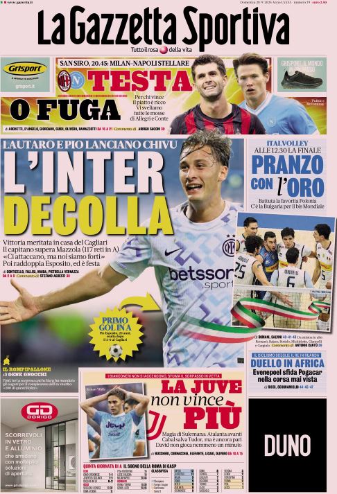 "L'Inter decolla". Questo il titolo in prima pagina dell'edizione odierna della Gazzetta dello Sport. La formazione di Cristian Chivu conquista tre punti importanti alla Unipol Domus. I nerazzurri si sono imposti 2-0 a Cagliari sui rossoblù di Pisacane grazie alla rete messa a segno dopo nove minuti da Lautaro Martinez e nella seconda frazione di gara da Francesco Pio Esposito.
