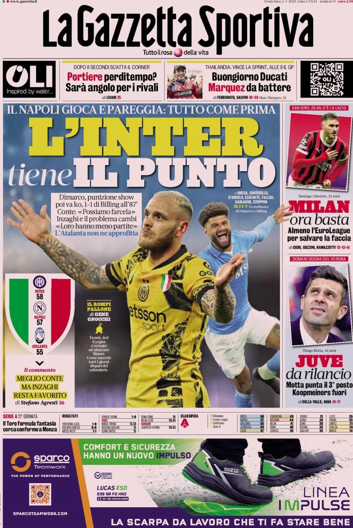 "Tutto come prima, l'Inter tiene il punto", si legge sulla prima pagina de La Gazzetta dello Sport. Finisce in parità la sfida Scudetto tra Napoli e Inter: "Dimarco, punizione show poi va ko, 1-1 di Billing all'87'. Conte: «Possiamo farcela». Inzaghi e il problema cambi: «Loro hanno meno partite».