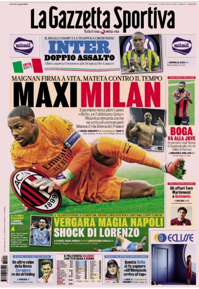 "Vergara, magia Napoli. Shock Di Lorenzo". E' questo il titolo che La Gazzetta dello Sport dedica al successo del Napoli di ieri contro la Fiorentina. In primo piano il Milan, con il rinnovo di Maignan e il possibile arrivo di Mateta: "Maxi-Milan".