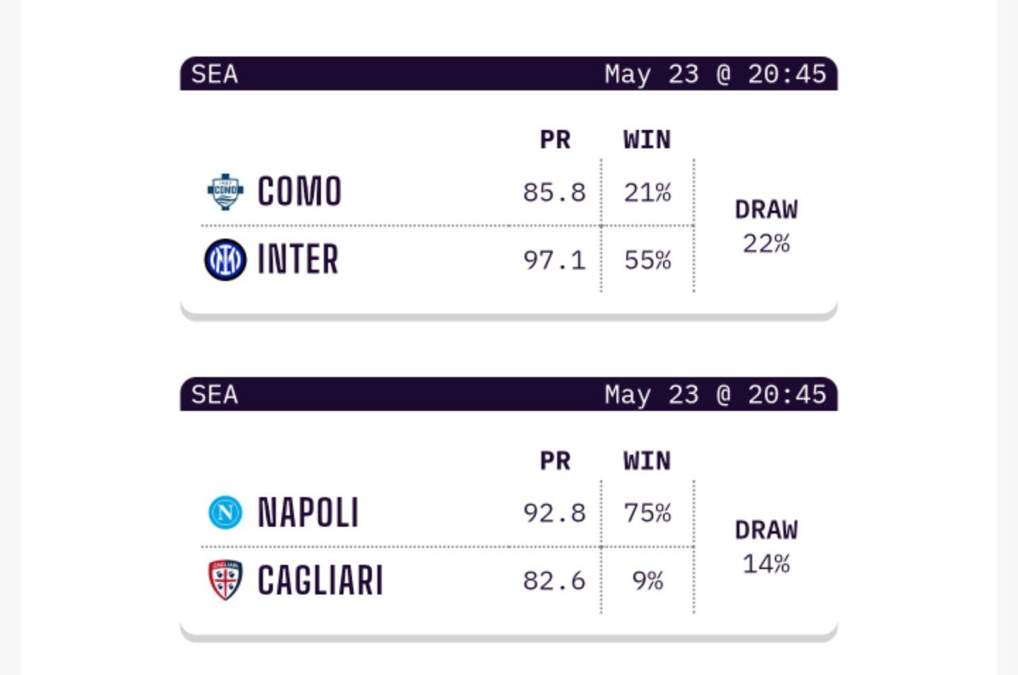 Opta ha pubblicato i pronostici delle due partite-Scudetto in programma stasera. Il Napoli parte con tutti i favori del pronostico in casa contro il Cagliari, con il 75% di possibilità di spuntarla e ottenere i tre punti che varrebbero lo Scudetto. Favorita, ma non di parecchio, l'Inter a Como: il successo, secondo lo studio dei colleghi, ha una percentuale del 55%.