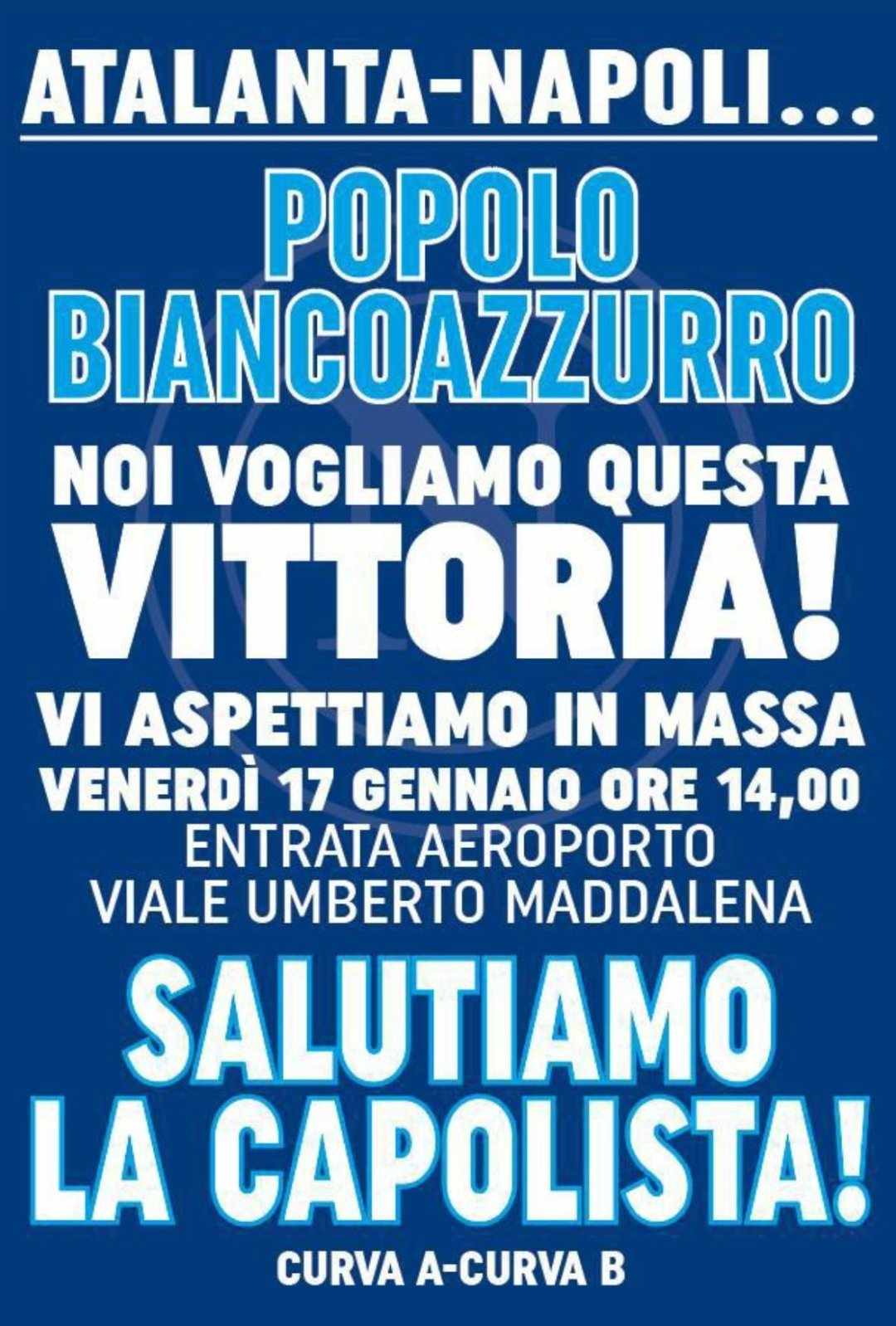 Il Napoli vuole scortare la squadra alla vigilia della trasferta contro l’Atalanta. Oggi pomeriggio appuntamento all’esterno dell’aeroporto di Capodichino per salutare i ragazzi di Conte pronti a partire per la gara di Bergamo. Nelle ultime ore sta circolando sui social un volantino, un invito per tutti a voler partecipare al saluto collettivo, l’abbraccio al Napoli prima di una gara delicata in chiave classifica per blindare il primo posto in campionato. Ecco il volantino: