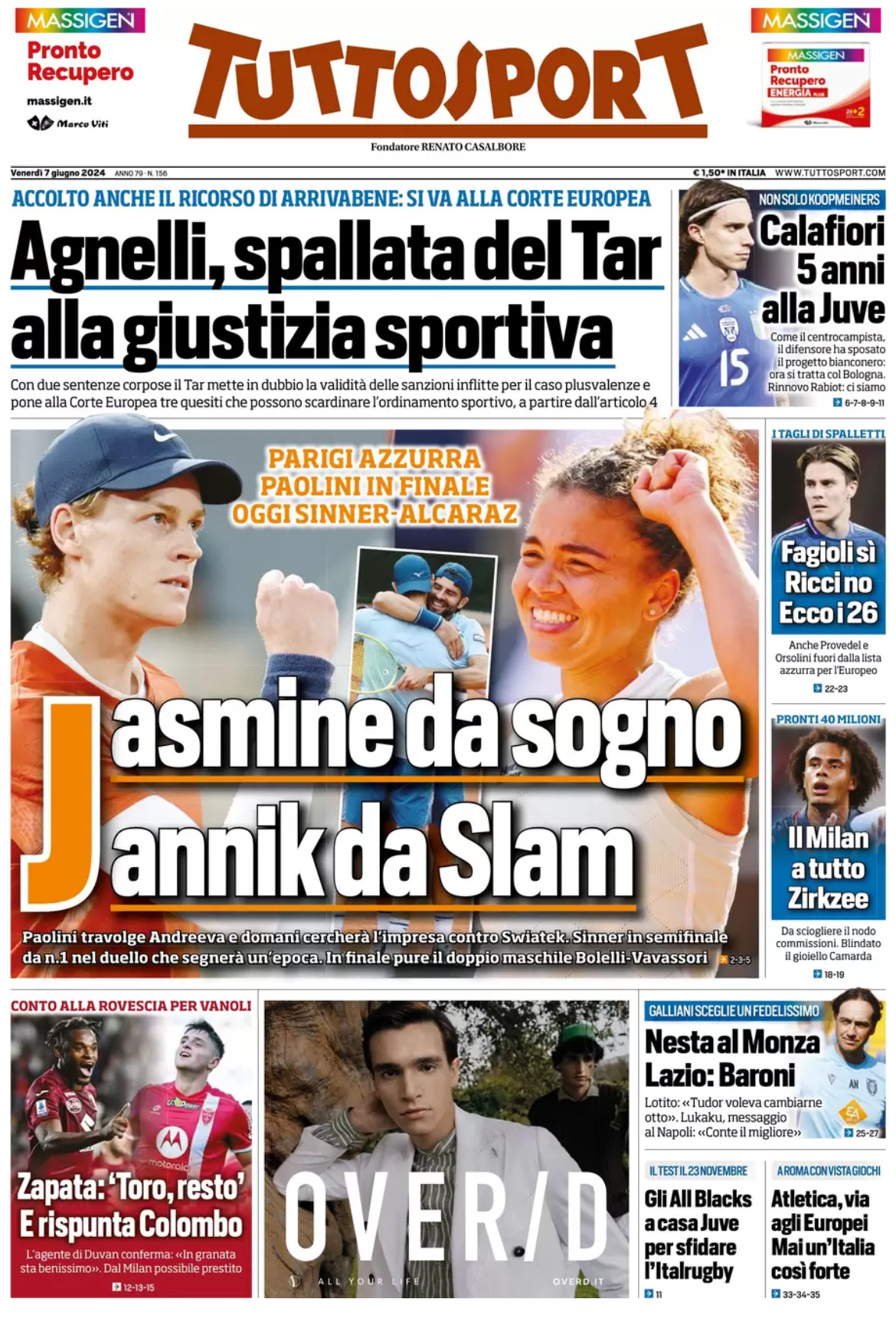 “Agnelli, spallata del Tar alla giustizia sportiva”. Titola così in taglio alto l’edizione odierna di Tuttosport: "Accolto anche il ricorso di Arrivabene: si va alla corte europea". Al centro si legge: "Jasmine da sogno. Jannik da slam. Parigi da sogno: Paolini in finale, oggi Sinner-Alcaraz". Di spalla il mercato della Juventus e del Milan e il valzer delle panchine.