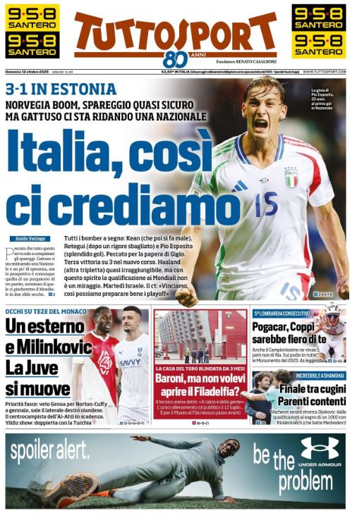 "Italia, così ci crediamo". Questo il titolo in prima pagina dell'edizione odierna di Tuttosport. L'Italia si è imposta per 3-1 sull'Estonia nel match valido per le qualificazioni al prossimo Mondiale. A segno Kean, Retegui e Pio Esposito ma la Norvegia si è imposta 5-0 su Israele confermando di fatto il primo posto. Gli azzurri dovranno conquistarsi i playoff per poi giocarsi la qualificazione al prossimo Mondiale.