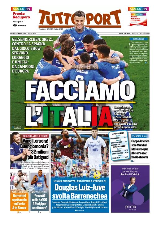 "Vanoli, ero ora! Buongiorno via? 32 milioni più Ostigard", scrive così in prima pagina l'edizione odierna del quotidiano torinese Tuttosport, parlando della possibile cessione al Napoli di Alessandro Buongiorno. L'apertura al centro è dedicata alla gara di stasera dell'Italia contro la Spagna: "Facciamo l'Italia". Il sommario: "Gelsenkirchen ore 21, contro la Spagna del gioco-show servono coraggio e umiltà: da campioni d'Europa". Un box è riservato al calciomercato della Juventus: "Douglas Lui-Juve svolta Barrenechea". Di seguito la prima pagina integrale