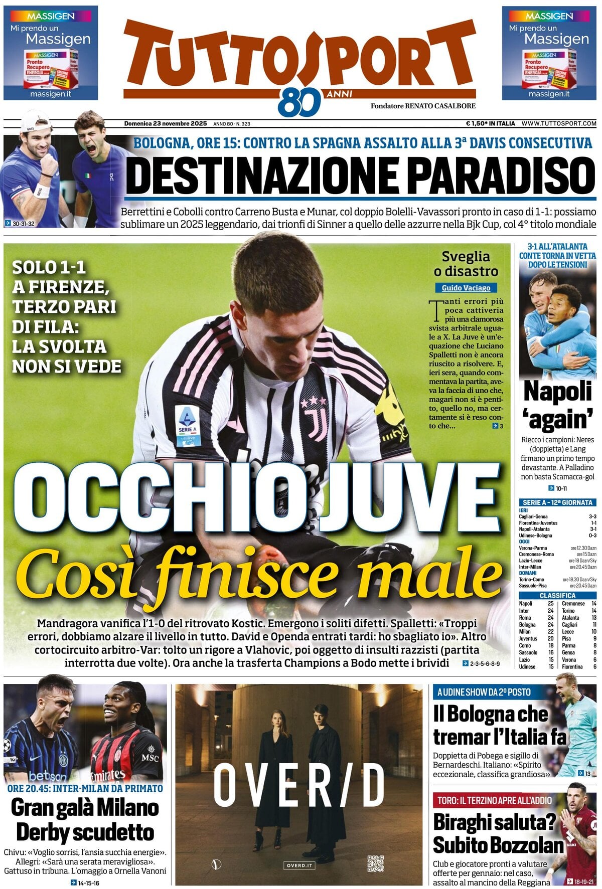 In occasione della prima pagina di oggi, Tuttosport titola così: "Occhio Juve, così finisce male". Solo 1-1 a Firenze, terzo pari di fila: la svolta non si vede. Mandragora vanifica l'1-0 del ritrovato Kostic: emergono i soliti difetti. Ora anche la trasferta Champions a Bodo mette i brividi.