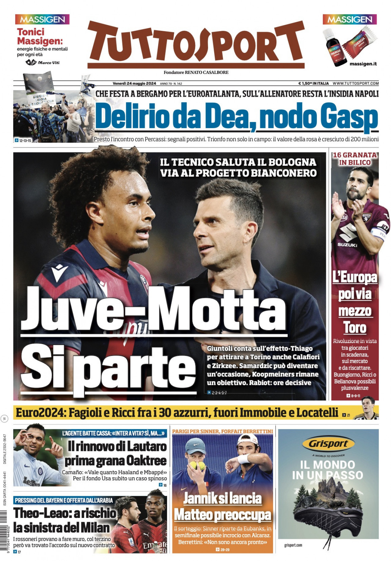 “Delirio da Dea, nodo Gasp”. Titola così in taglio alto l’edizione odierna di Tuttosport: "Che festa a Bergamo per l'EuroAtalanta, sull'allenatore resta l'insidia Napoli. Presto l'incontro con Percassi: segnali positivi. Trionfo non solo in campo: il valore della rosa è cresciuto di 200 milioni". Al centro Thiago Motta e il suo futuro alla Juventus: "Juve-Motta, si parte". Focus anche sui giocatori del Torino: "L'Europa, poi via mezzo Toro". In taglio basso l'attenzione è su Lautaro, Theo e Leao.