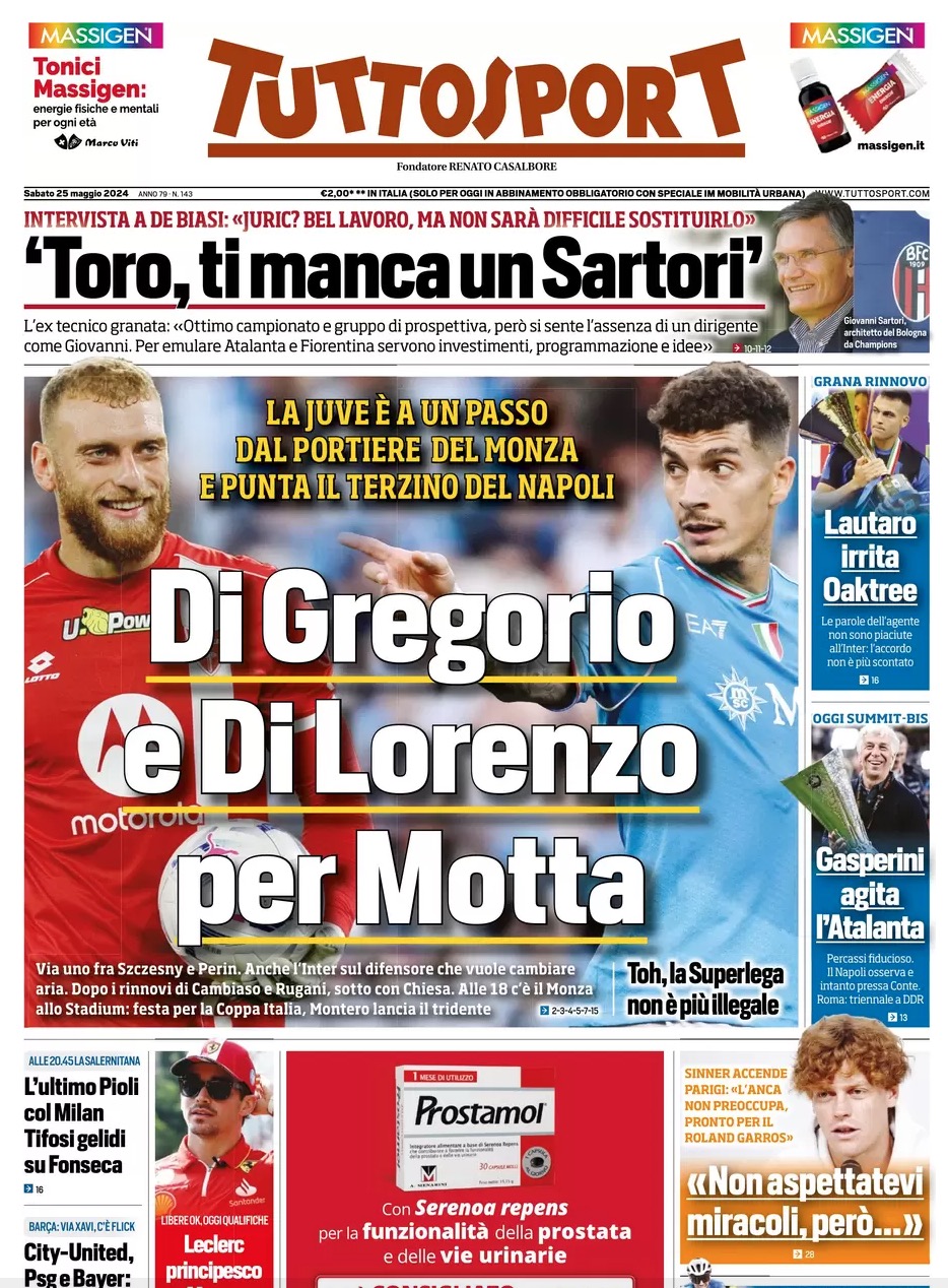 "Di Gregorio e Di Lorenzo per Motta", titola quest'oggi il quotidiano torinese Tuttosport raccontando che il portiere del Monza è ormai ad un passo ed il ds Giuntoli punta anche il capitano del Napoli che vuole cambiare aria, ma su cui però c'è anche l'Inter. Di spalla "Gasperini agita l'Atalanta", anche se Percassi è fiducioso, col Napoli che osserva e pressa Conte. Di seguito la prima pagina integrale.