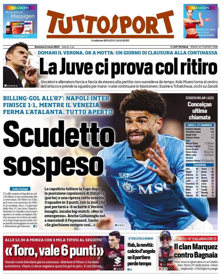 "Scudetto sospeso". Questo il titolo in prima pagina dell'edizione odierna di Tuttosport. Il riferimento è al pareggio nello scontro al vertice fra Napoli e Inter. Al "Maradona" la formazione di Simone Inzaghi si è portata in vantaggio nel primo tempo con Dimarco ma nella ripresa Billing ha fissato il punteggio sull'1-1 finale.