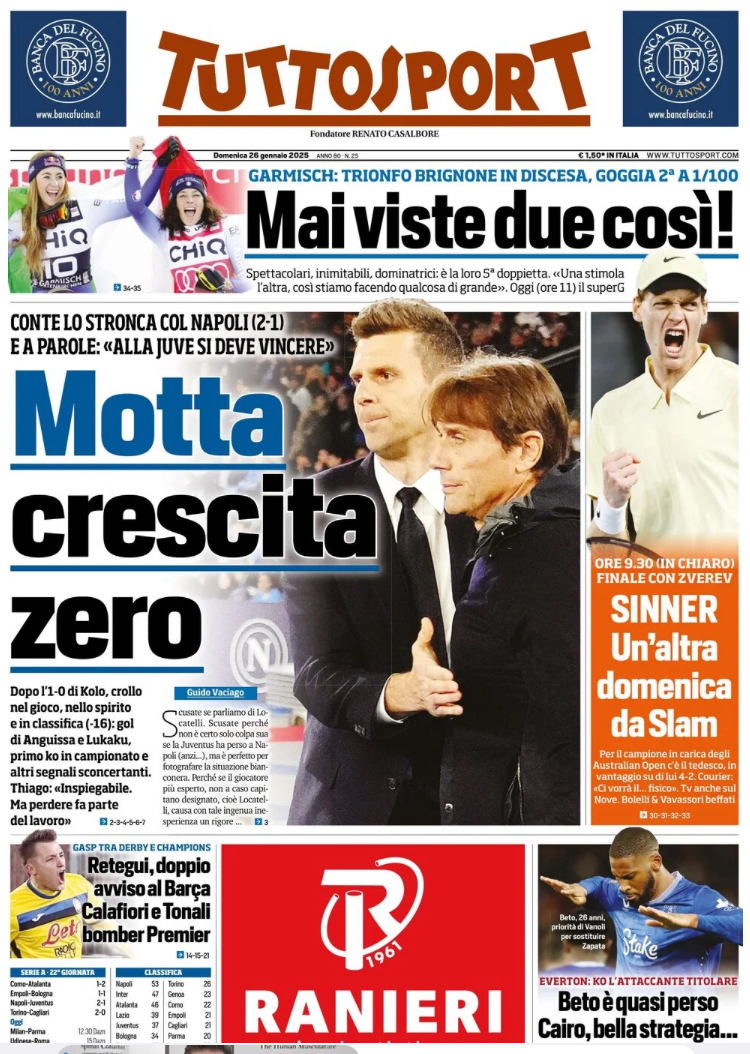 "Motta, crescita zero". Questo il titolo in prima pagina dell'edizione odierna di Tuttosport. Il riferimento è alla sconfitta della Juventus ieri nel match del "Maradona" contro il Napoli. La squadra di Antonio Conte, sotto 1-0 con il primo gol di Kolo Muani, ha rimontato i bianconeri di Thiago Motta vincendo per 2-1.