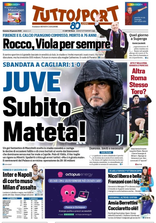 "Inter e Napoli di corto muso, Milan d'assalto". E' questo il titolo che Tuttosport dedica al Napoli, in taglio basso, oggi in prima pagina. L'apertura è dedicata alla Juventus e alla sconfitta di Cagliari. Il quotidiano invoca il mercato per la reazione: "Juve, subito Mateta". Per il giornale il mercato è una necessità per Luciano Spalletti.