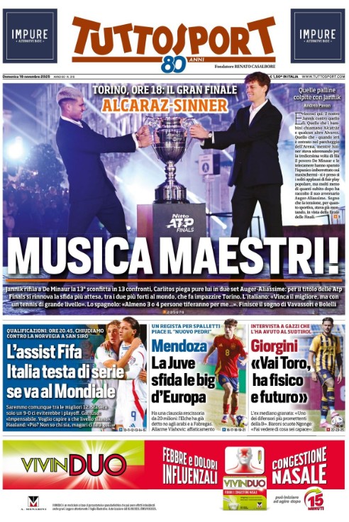 "L'assist FIFA, Italia testa di serie se va al Mondiale", si legge questa mattina sulla prima pagina di Tuttosport. Saremmo comunque tra le migliori dodici. Stasera solo un 9-0 ci eviterebbe i playoff. Gattuso: "Impensabile, voglio capire a che livello siamo". Haaland: "Pio Esposito? Non si chi sia, magari ci fa 3 gol..."