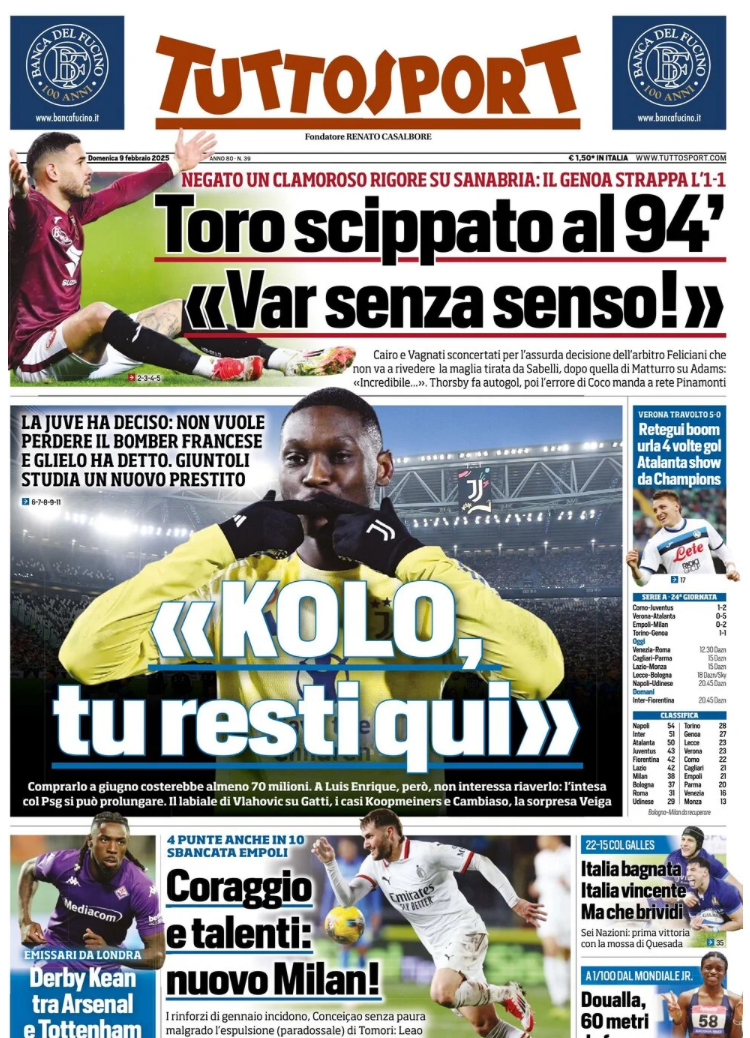 Cinque gol in tre partite. Randal Kolo Muani ha avuto un impatto devastante sulla nostra Serie A. E la Juventus starebbe già pensando al rinnovo di un prestito con l'intenzione di tenerlo alla Continassa anche per la stagione prossima. Questo il titolo in prima pagina dell'edizione odierna di Tuttosport: "Kolo, tu resti qui".