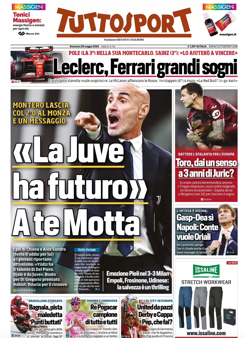 "'La Juve ha futuro'. A te Motta", titola con le parole di Paolo Montero l'edizione odierna del quotidiano torinese Tuttosport, invocando il nuovo allenatore Thiago Motta. Il sommario: "Montero lascia col 2-0 al Monza e un messaggio". In spalla spazio all'intreccio Conte-Gasperini per quanto riguarda le panchine di Napoli e Atalanta: "L'intesa è vicina. Gasp-Dea sì. Napoli: Conte vuole Oriali". Il commento: "De Laurentiis spinge, l'ex ct chiede anche il suo team manager in azzurro". Un box è riservato alla possibilità dei granata di qualificarsi in Conference League: "Toro, dai un senso a 3 anni di Juric?". Di seguito la prima pagina integrale