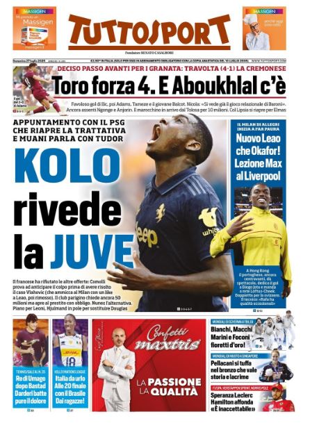 "Kolo rivede la Juve". Questo il titolo in prima pagina dell'edizione odierna di Tuttosport. Arrivano buone notizie per la Juventus che potrebbe tornare sull'attaccante francese.