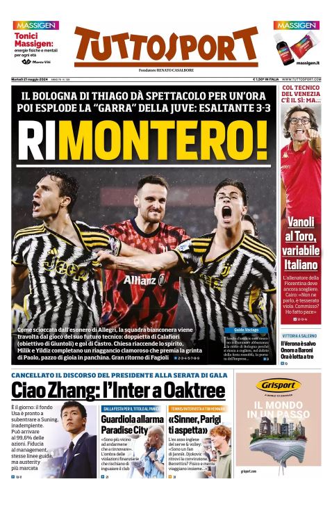 "RiMontero!", titola così nell'edizione odierna il quotidiano torinese Tuttosport, parlando della rimonta della Juventus alla prima di Paolo Montero sulla panchina bianconera. Il sommario: "Il Bologna di Thiago dà spettacolo per un'ora, poi esplode la 'garra' della Juve: esaltante 3-3". In taglio basso spazio alle questioni societarie in casa nerazzurra: "Ciao Zhang: l'Inter a Oaktree". Il commento in alto: "Cancellato il discorso del presidente alla serata di gala". In spalla un box è riservato al possibile nuovo allenatore dei granata: "Vanoli al Toro, variabile Italiano". Di seguito la prima pagina integrale