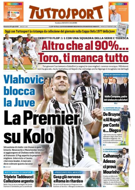 "La Premier su Kolo". E' questo il titolo d'apertura dell'edizione odierna di Tuttosport, che si sofferma sul mercato della Juventus e tratta soprattutto le manovre bianconere per l'attacco, tra entrate e uscite. "Vlahovic blocca la Juve", si legge ancora sul quotidiano piemontese.
